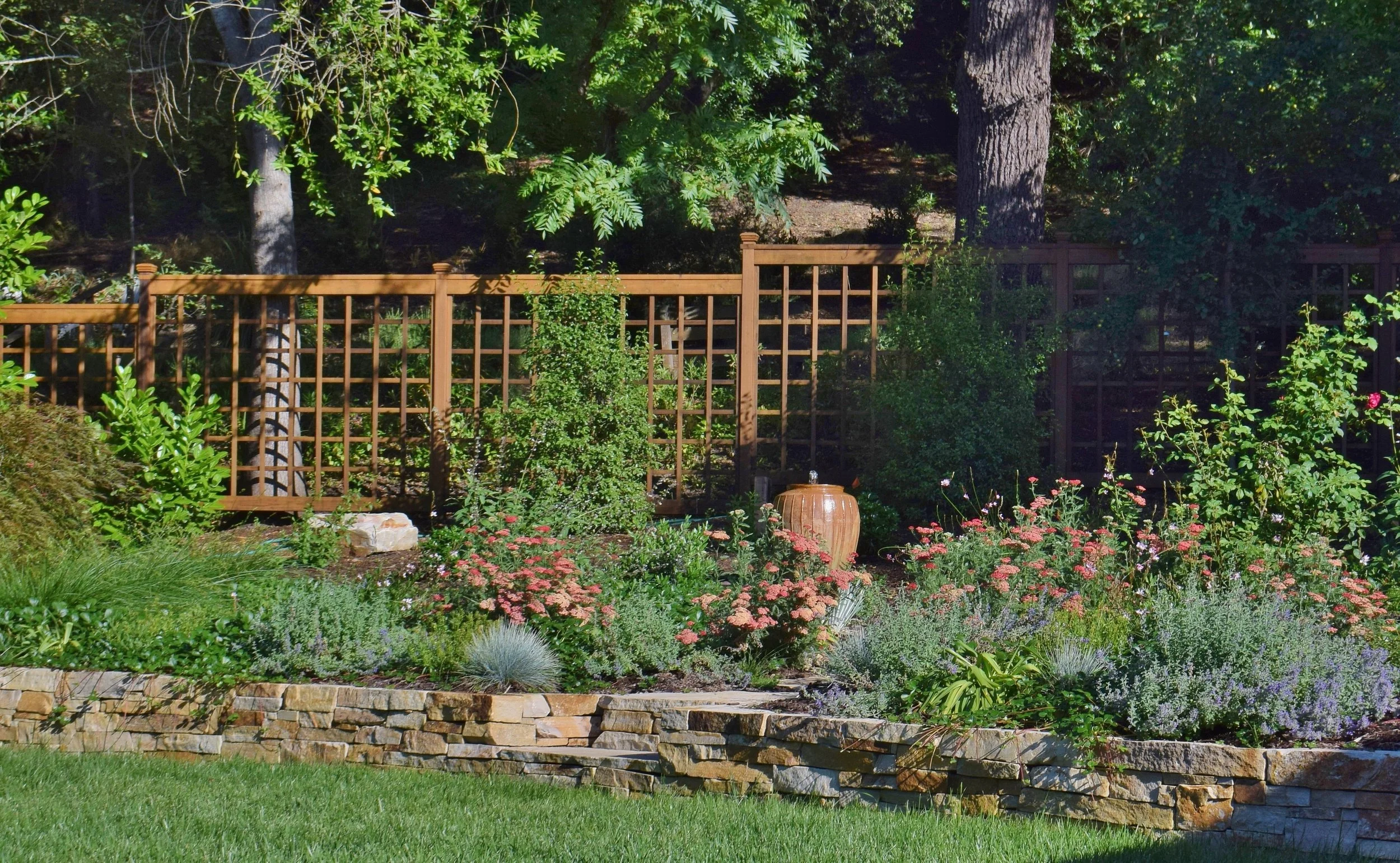 The Utah Stone wall is mortar free, with an integrated step which begins a pathway loop of gorgeous flagstone pieces. The open custom lattice fence suggests the garden border yet borrows the landscape beyond for depth. The rectangular fence lites reflect the similar character of the stone. The urn converted to a fountain draws hawks, finches, and woodpeckers. There are 5 boulders which provide focal points of interest and places to sit and linger in appreciation. This garden is less than 2 years old.